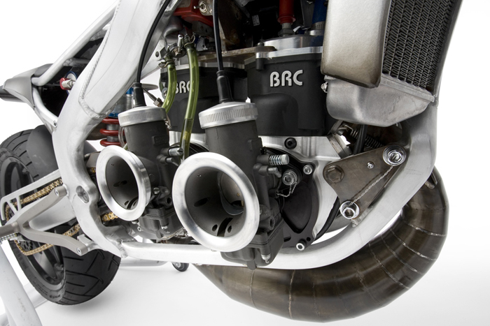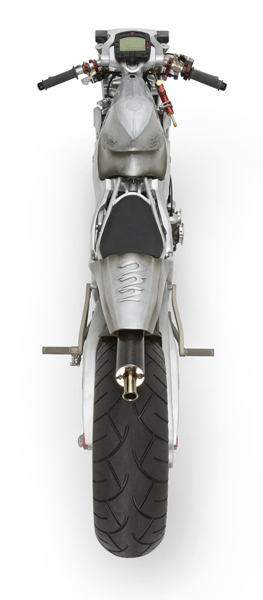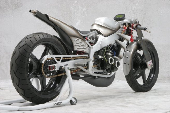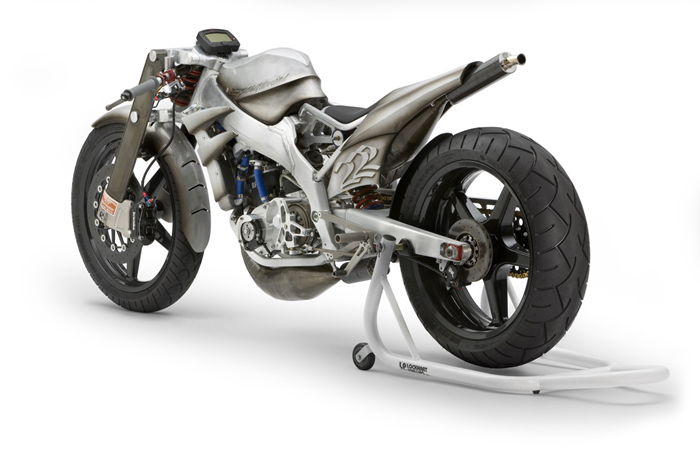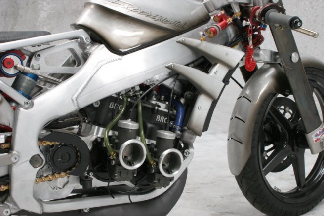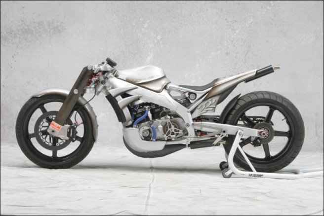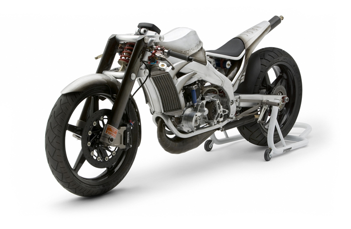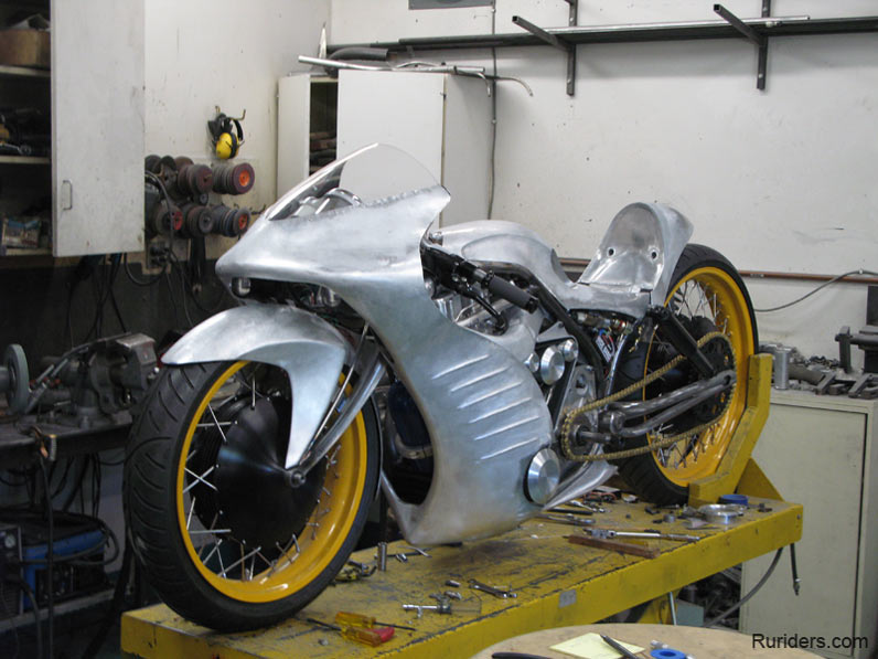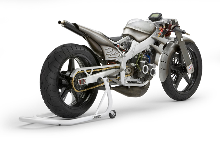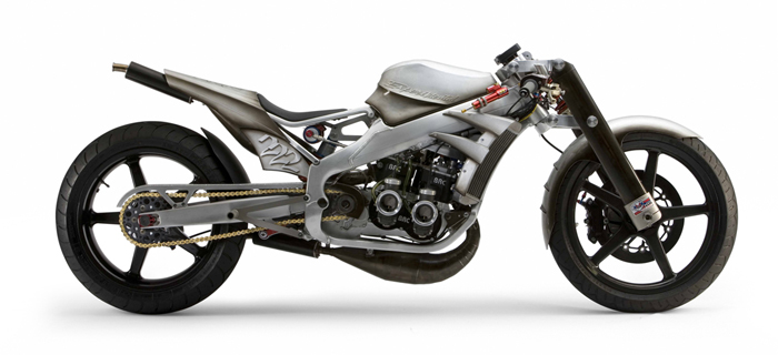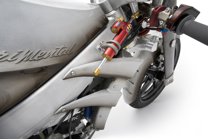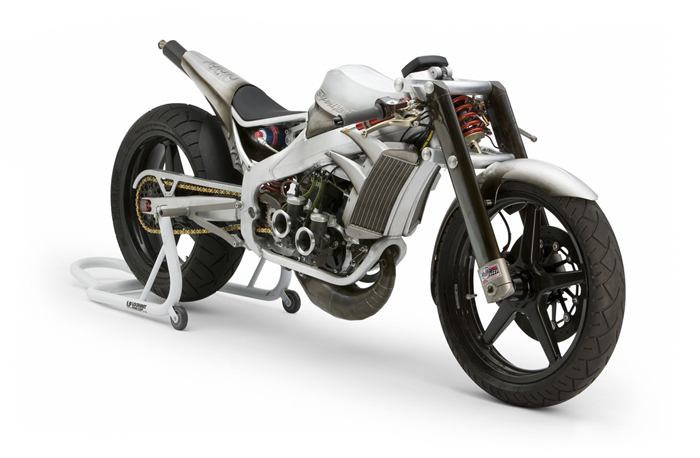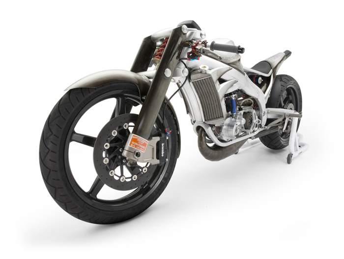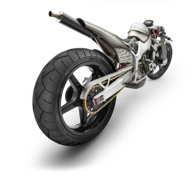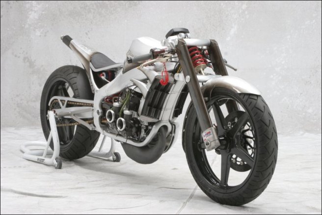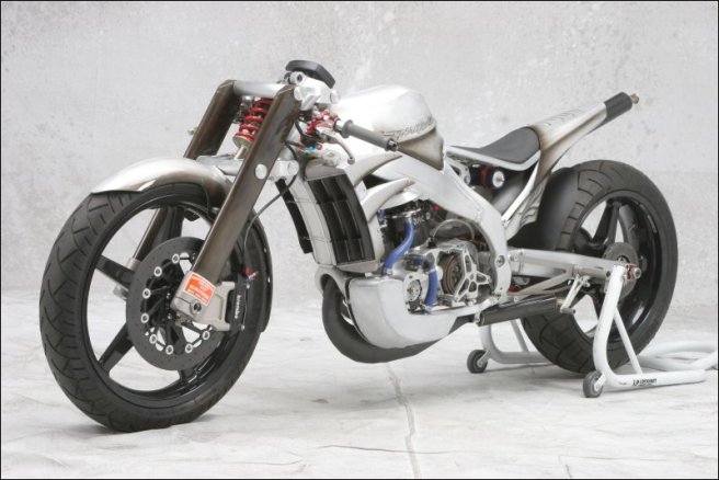 - Роджер изобрёл и изготовил собственный распредвал и минимизировал возможность ошибки пилота с помощью установки электрического переключателя скоростей- Искусно изготовленное алюминиевое тело мотоцикла не только спортивно и гармонично, но ещё и соответствует требованиям всех аэродинамических законов