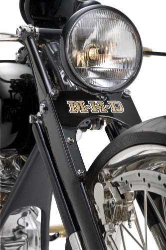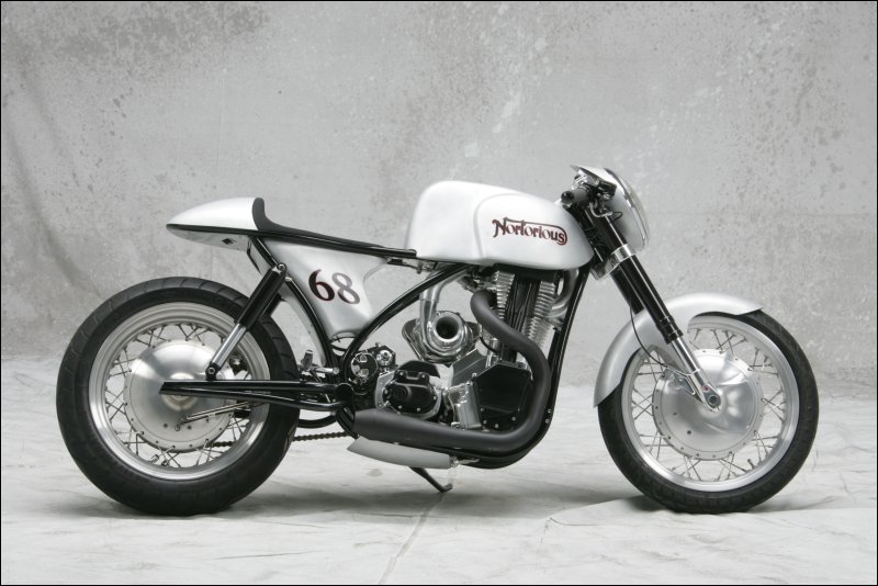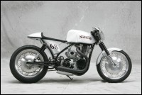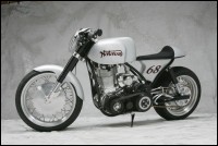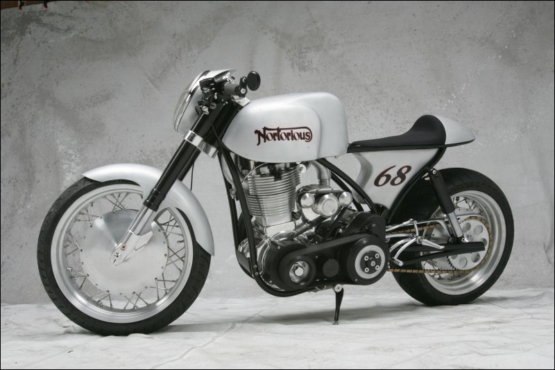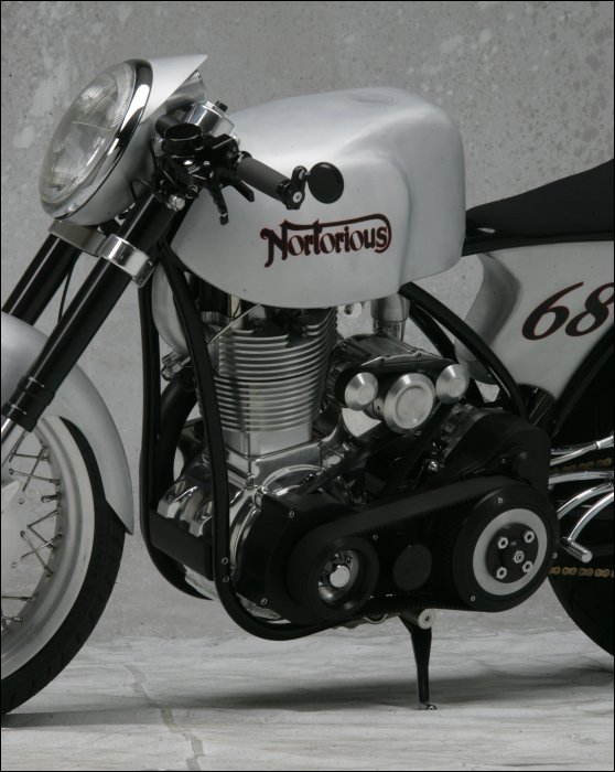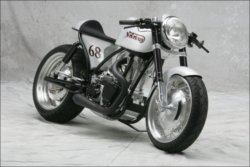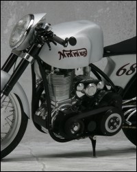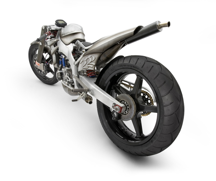 Много сделано в самой мастерской: от распределительного вала, который имеет два кулачка, до изменения угла толкателя. Двигатель был повернут назад на 15 градусов, и расположен ближе к трансмиссии. Все, начиная от рамы до вилки, двух колес и скрытых дисковых тормозов, было сделано в его мастерской. Трансмиссия – шестиступенчатая коробка передач Baker. С помощью воздухозаборника в передней части мотоцикла удалось обеспечить мощный поток воздуха к двигателю, чтобы увеличить интенсивность охлаждения и поддерживать температурный режим, даже если байк работает на пределе.