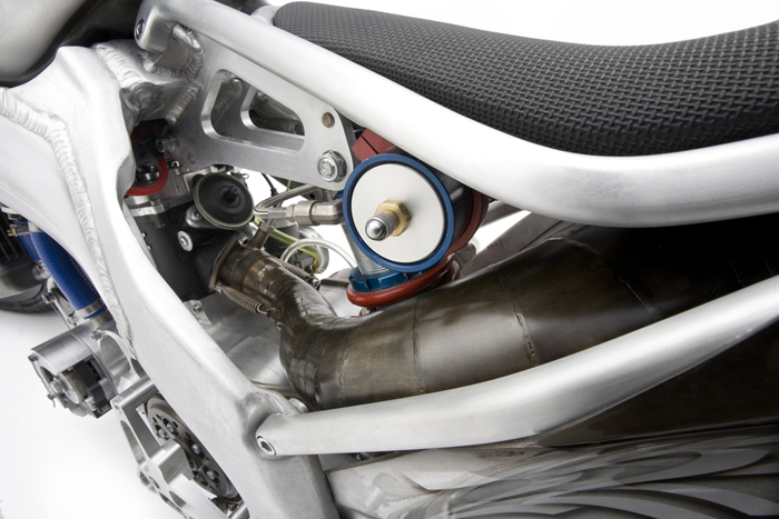 Итак, что же находится внутри аппарата? Goldmember оснащен кастомизированным одноцилиндровым двигателем объемом 960 см3 с перенесенным задним цилиндром на место переднего, а на освободившееся после переноса место установлен суперчарджер Rotrex. Электронный впрыск топлива осуществляется с возможностью подачи закиси азота (NOS), как на спортивных боллидах. Роджер не может не верить в одноцилиндровые двигатели, такие, как в его моделях Nortorious и ExperiMental, потому что они его не подводят.