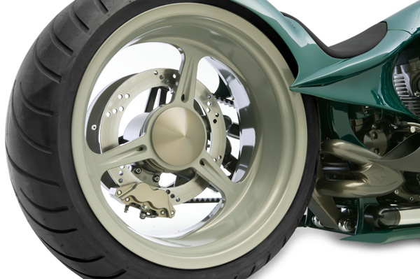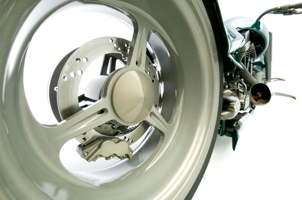 Колёса подобной формы и содержания внимательные читатели уже видели на мотоцикле Голдаммера Nortorious, напомню лишь, что их тоже самостоятельно изготовил Роджер, а то, что так смахивает на огромный барабанный тормоз на самом деле кожух вполне современных дисков, к тому же отлично вентилируемых.