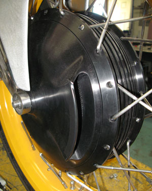Колёса самостоятельно изготовил Роджер, а то, что так смахивает на огромный барабанный тормоз, на самом деле кожух вполне современных дисков, к тому же отлично вентилируемых.