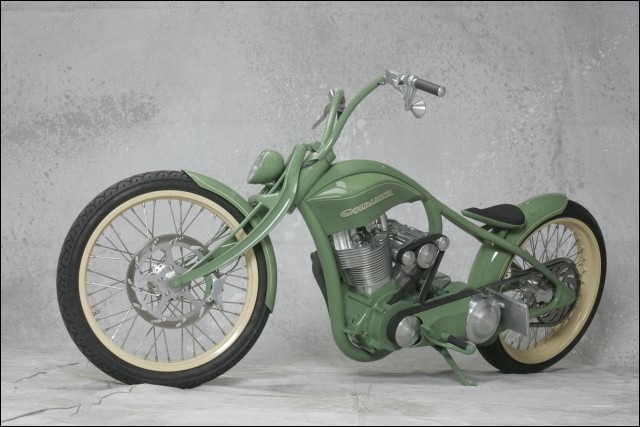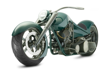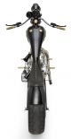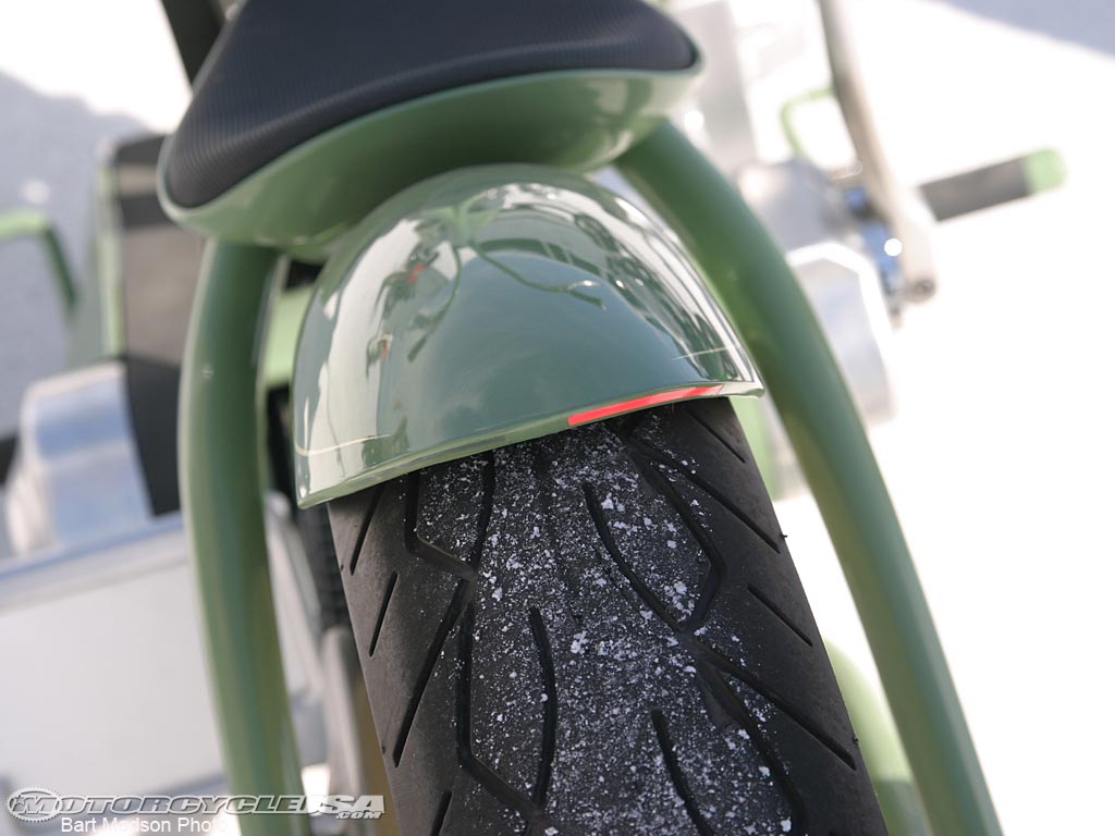 Perhaps the greatest achievement of "Trouble" is it's wild minimalist style. From the preying-mantis-like front end to the 23-inch rear and 21-inch front wheels, the flat green "Trouble" registers an absolute 10 on our coolness scale.
