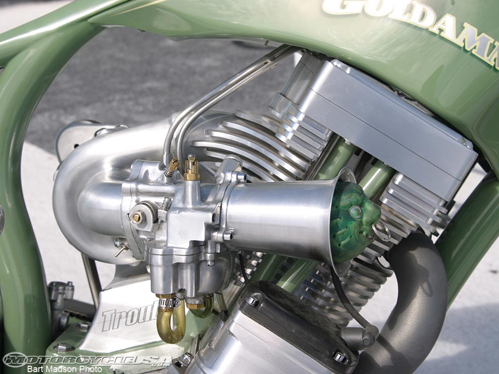 But MotorcycleUSA isn't the only one to gush over Goldammer's work, as his fellow countryman have recognized his talent by bestowing a 2006 B.C. (British Columbia) Creative Achievement Award in industrial design. Goldammer has also been praised by his custom builder peers, with "Trouble" having won the American Motorcycle Dealer magazine bike show in 2005, an event which is judged by the builders themselves.