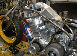 Двигатель: Одноцилиндровый, на базе HD V-twin, объём 965 куб.см., суперчарджер Rotrex, инжектор, система Nitros, самодельный распредвал