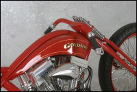 Taillights aren't the only components which adorn "Trouble" in the most innocuous manner. As befits most current custom creations, the electrical, oil, and hydraulic systems are all routed inside the frame through 11 internal lines. The clever rear brake rotor does double duty as the sprocket for the final chain drive. Even the girder-looking front-end suspension conceals an unseen surprise, with the top end of the girder actually a rocker arm that activates a hidden shock placed inside the neck of the frame.Goldammer's skill with front-end construction shouldn't come as a big surprise, as his sleek billet front-ends are the hallmark components emanating from his Goldammer Cycle Works garage. Receiving professional education from the BC Institute of Technology and the famous Motorcycle Mechanics Institute in Phoenix, Goldammer has been building bikes at his shop for a decade now, but fabricating his aftermarket V-Twin components is what pays the bills. "I almost do that just to support my habit of building these crazy bikes," explained Goldammer.