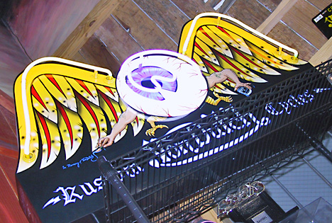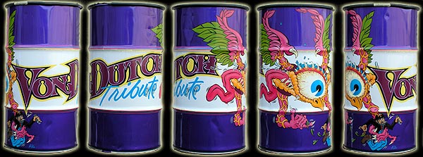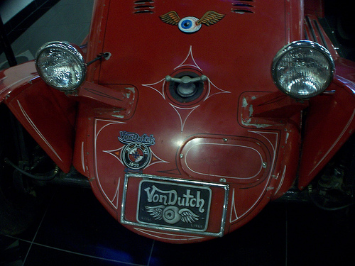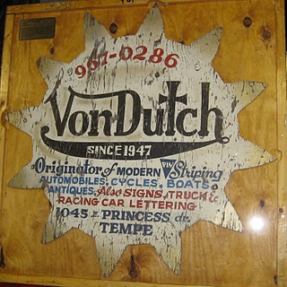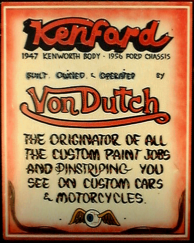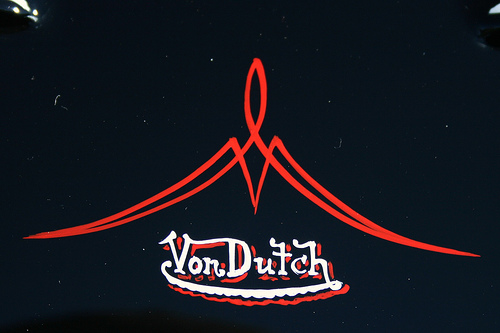 Помимо термина «kustom культура,» и применение его к аспектам более претендующим на тонкий вкус хот-рода и кастомайзинга, мероприятие показало связку со старинным Dutchery, включая приборную панель в тонкую полоску для классической кастома Mercury, Hirohata Merc. Другие видели только деньги, когда вспоминали истории из жизни Von Dutch, и его, единственных в своем роде, художественных работах, и это – то, где неприятности, собственно, и начались. Спустя десятилетие после его смерти, копировальные аппараты находятся теперь в арбитраже в лосанджелесском Верховном суде, который пытается выяснить раз и навсегда, кто имеет права на все наследие Von. Многие вещи вышли из-под контроля, но все началось с одного человека. Он первым стал думал как подпись Von Dutch, и возможно логотип Flying Eyeball или все это вместе будет выглядеть на футболке или рубашке. «Когда мне было лет 16, я прочитал статью о Von Dutch, который просто очаровывал всем,» сказал владелец концерта Long Beach и модельер Эд Босвелл.