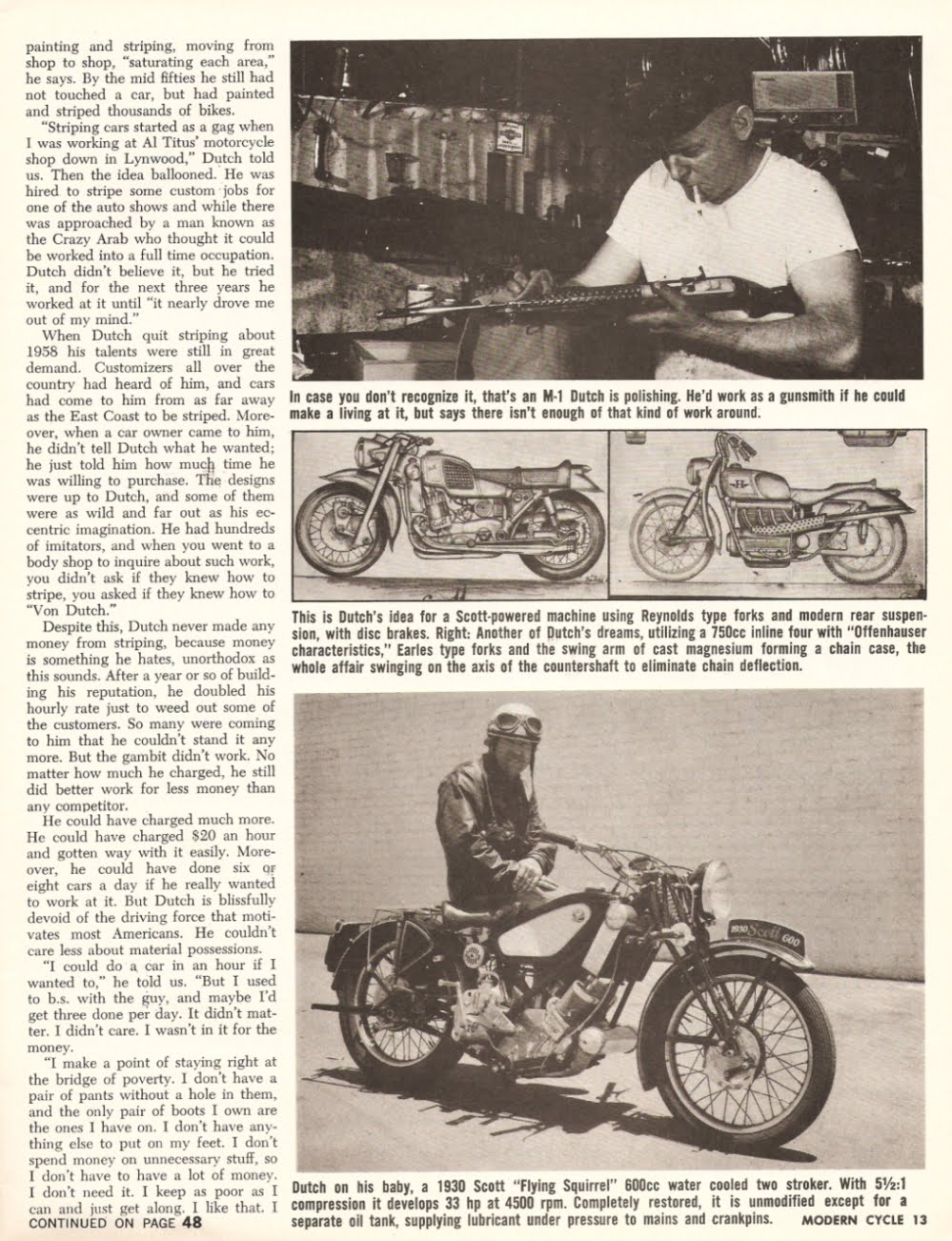 Таким образом, все это вышло нелепым или даже жестоким, получилось, что громкое прозвище съело своего создателя. Ему подобных множество на свете, Менкен назвал бы их болванами, которые послали себя в тираж, разменяли на массовую истерию – разве такие не живут только в виде фото и надписей исключительно на поношенных шляпах и футболках своих фанатов подобно Бритни Спирс, Гвен Стефани и Аштон Кучер? Действительно ли Von Dutch был обречен, как один поклонник выразился, «навсегда запомнилось его имя на шортах на чьей-то заднице»? Он был Von Dutch (упрямый как голландец) – да, какое прозвище, такой и человек. Он оказался в одном ряду с этими премудрыми модными парнями типа вонючего, вечно в ядовитом облаке лака живописца Джорджа Барриса, позже кастомизировавшего Эд «Big Daddy» Roth и такого же неадекватно модного артиста Роберта Виллиамса. Начиная с 1950-ых годов, Von Dutch дал вторую жизнь автомобильному пинстрипингу (Pinstriping), превращая каждую свою работу в настоящее искусство, давая выход своим фантазия. Он был превосходным мастером, который искусно делал ножи, оружие и моторизованные ролики.