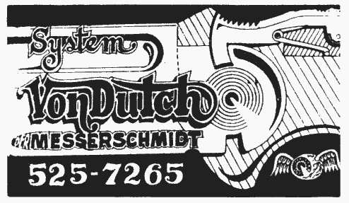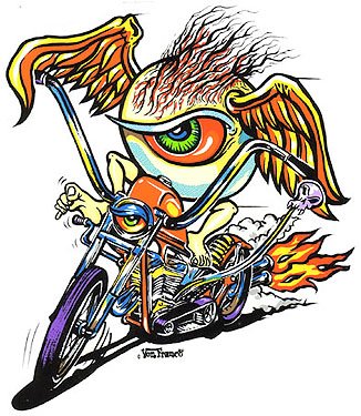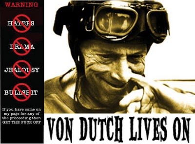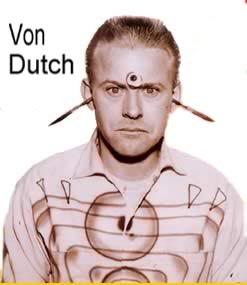 Датч профессионально занимался рисованием с 10 лет. Уже тогда он придумал свой “глаз с крылышками” (идея-то тиснута у древних египтян!). Вместе с вязью букв “Von Dutch”, напоминающей эмблему мотоцикла Norton, глаз стал его маркой и легендой контркультуры.
