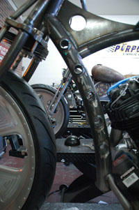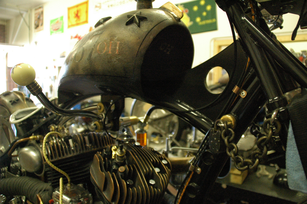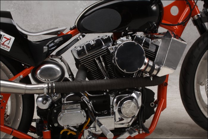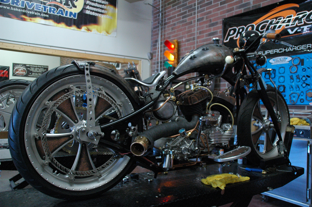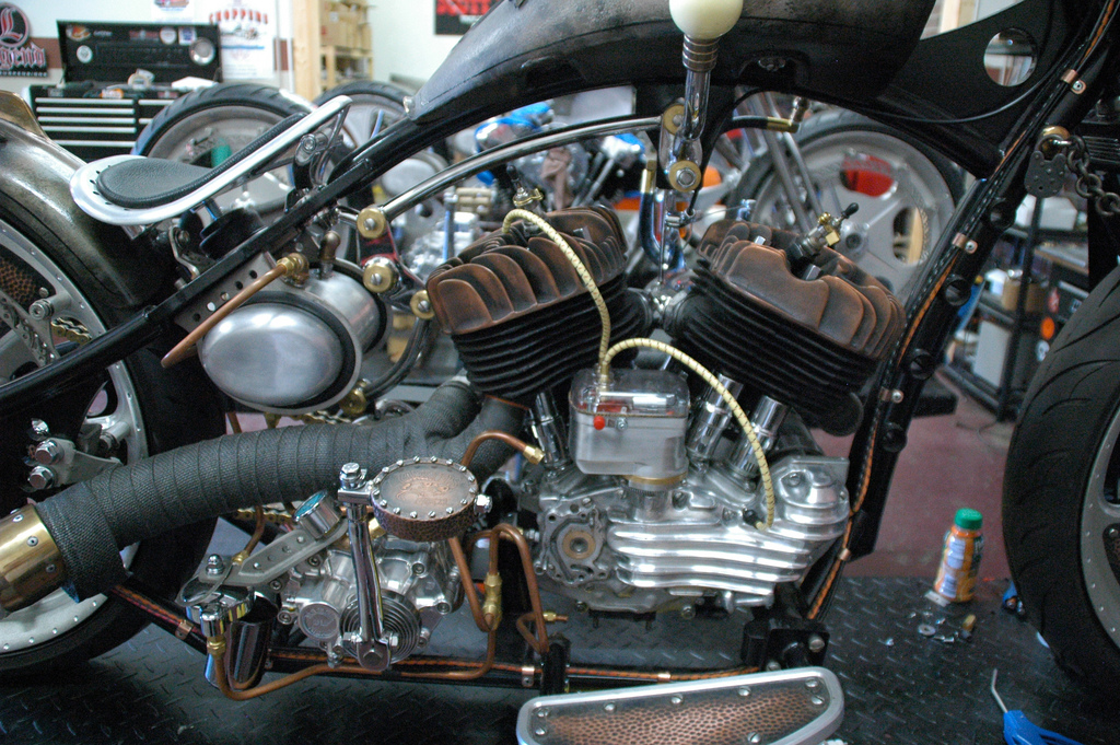 Engine Assembly by Huey Schwebs. Intake by Scott Webster consists of a Linkert m74 carb and forward draft intake, hand built exhaust. Kiwi springer front end. Drive is a Evil Eng linkage Scott Webster. Kicker Pedal Kith Webster original as well as all major machining of components... the kids good... and my brother... that's why he works for me. Wiring Matt and Jared my numero one homeboys.
