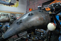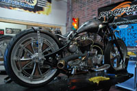 Pipes are Supertrapp modified, the carburator is Carls Speed Shop, primary drive is a Bandit/Leroy-Thompson modified, oil tank - Leroy-Thompson, gas tank - Metal Monsters, electrical - Wire Plus, Rear Fender - Fat Katz modified.