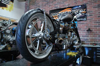 Передний перевертыш изготовлен в мастерской Mean Street. Тормозные системы от Brembo идеально подходят под новые характеристики, но сам диск размещен по «школе Эрика Бьюлла» на ободах колес. Причем не только передний, но и задний. Дизайн колесных дисков великолепный! В тему! В гоночном духе выполнено седло-крыло с характерным аэродинамическим уступом. Передняя часть рамы повторяет по изгибу полурадиус большого переднего колеса. Рейк вилки – 27 градусов. Выпускная система оформлена по спортивному брутально и просто. В этом же стиле и головная светооптика.