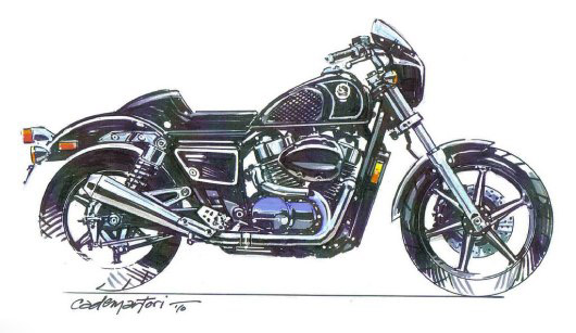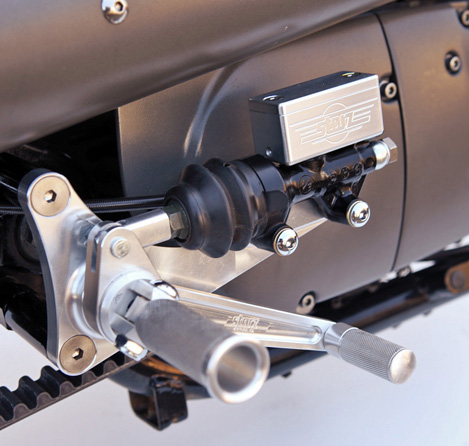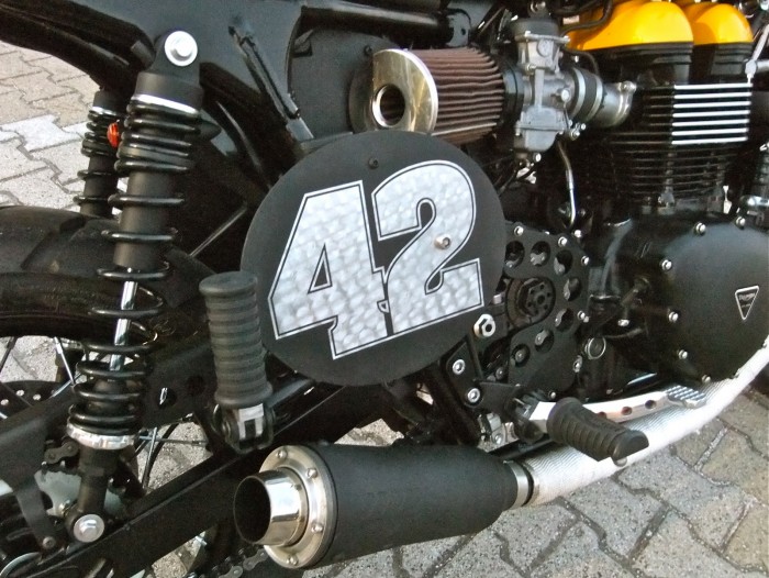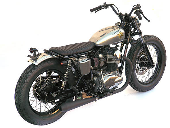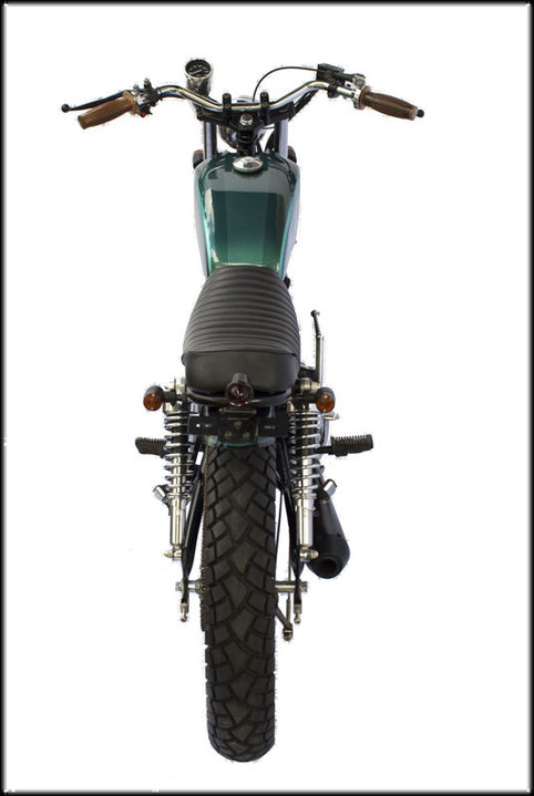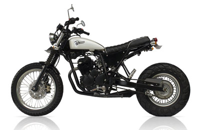 Новшества: модифицированное шасси, передняя вилка от Kawasaki GPZ900R, регулируемые амортизаторы Bitubo, сцепление с гидроприводом. Алюминиевый маятник изготовлен с учетом особенностей именно этого аппарата. Тормозная система Beringer, передний диск диаметром 300 мм, задний – 240 мм. Колесные диски диаметром 17 дюймов с покрышками Pirelli 120/70 спереди и 160/60 – сзади. Пожалуй, главные особенности внешности: тюнинговый «хвост» с сиденьем, отделанным «нескользящим» материалом, яркие зелено-желтые цвета раскраски и, конечно, знаменитые скрэмблеровские выхлопные трубы – они расположены высоко и горизонтально. Очень харизматичная машина.
