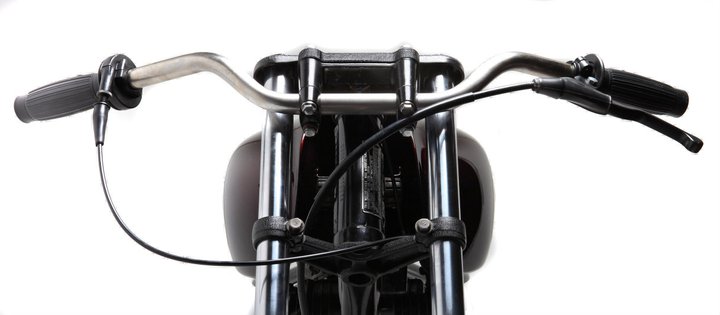 Внутри нетронутой рамы сидит мотор от 2004 Harley-Davidson 1200 Sportster, с которым решили не делать ничего радикального. Зато на выпускной системе ребята оторвались по полной, создав ее вручную. От двигателя до глушителя она выглядит по-скрэмблерски, что подчеркивается защитным экраном и матовой черной окраской. Но вот глушитель подозрительно напоминает решение, популярное среди производителей выпускных систем для спортбайков. На каком-то «джиксере» я уже видел этот «конец»…