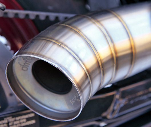 Что еще сразу бросается в глаза - это белые трубы впуска/выпуска. Ник говорит: "Я хотел, чтобы система впуска/выпуска находилась высоко, поэтому все трубы я собрал в районе двигателя в одну непрерывную форму. Это стандартные автомобильные выхлопные трубы, окрашенные аэрозолем белой краски, специально предназначенной для выхлопных систем".