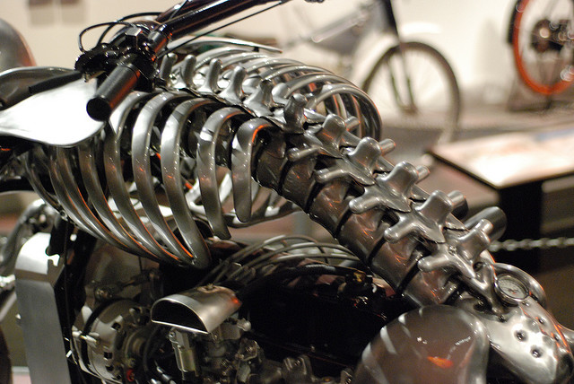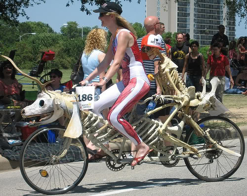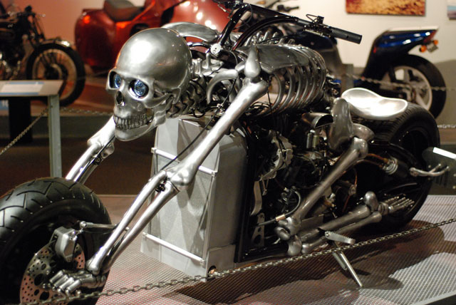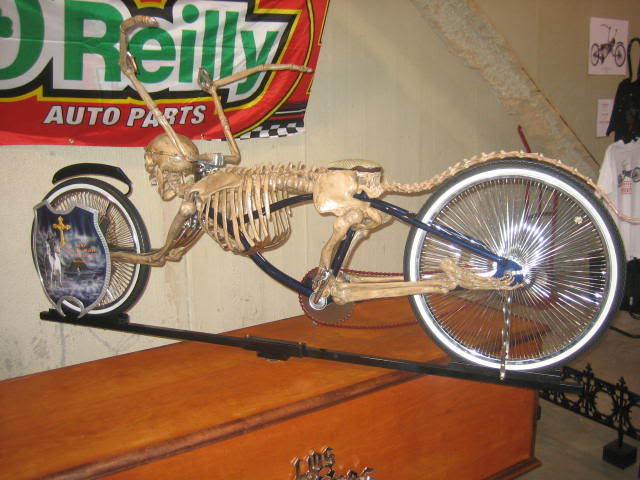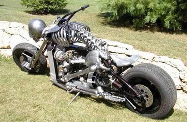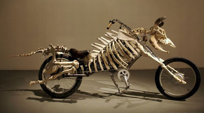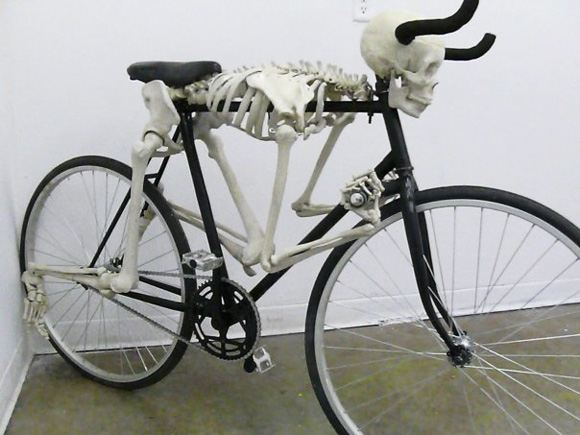 The skeleton bike you see here has arms resting on the front and legs on the rear tires. By chance we don’t have the info about this one as to who made it but its eye catching and worth including here.
