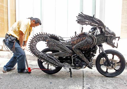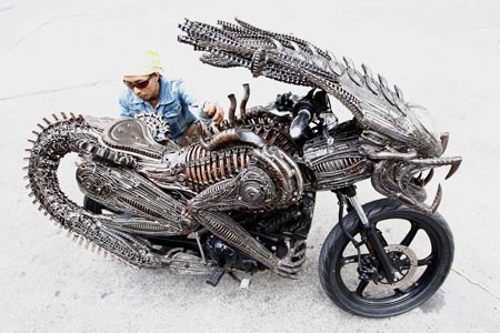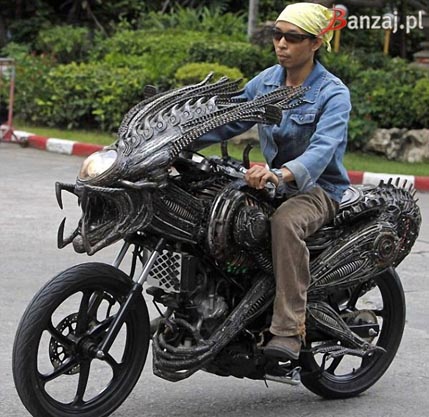Надо заметить, что получилось это на славу: мотоцикл действительно похож на Хищника, а голова инопланетянина выполнена просто мастерски! Всем, кто является поклонником фантастики, космических героев и мотоциклов одновременно, зрелище такого уникального транспортного средства явно придётся по душе.
