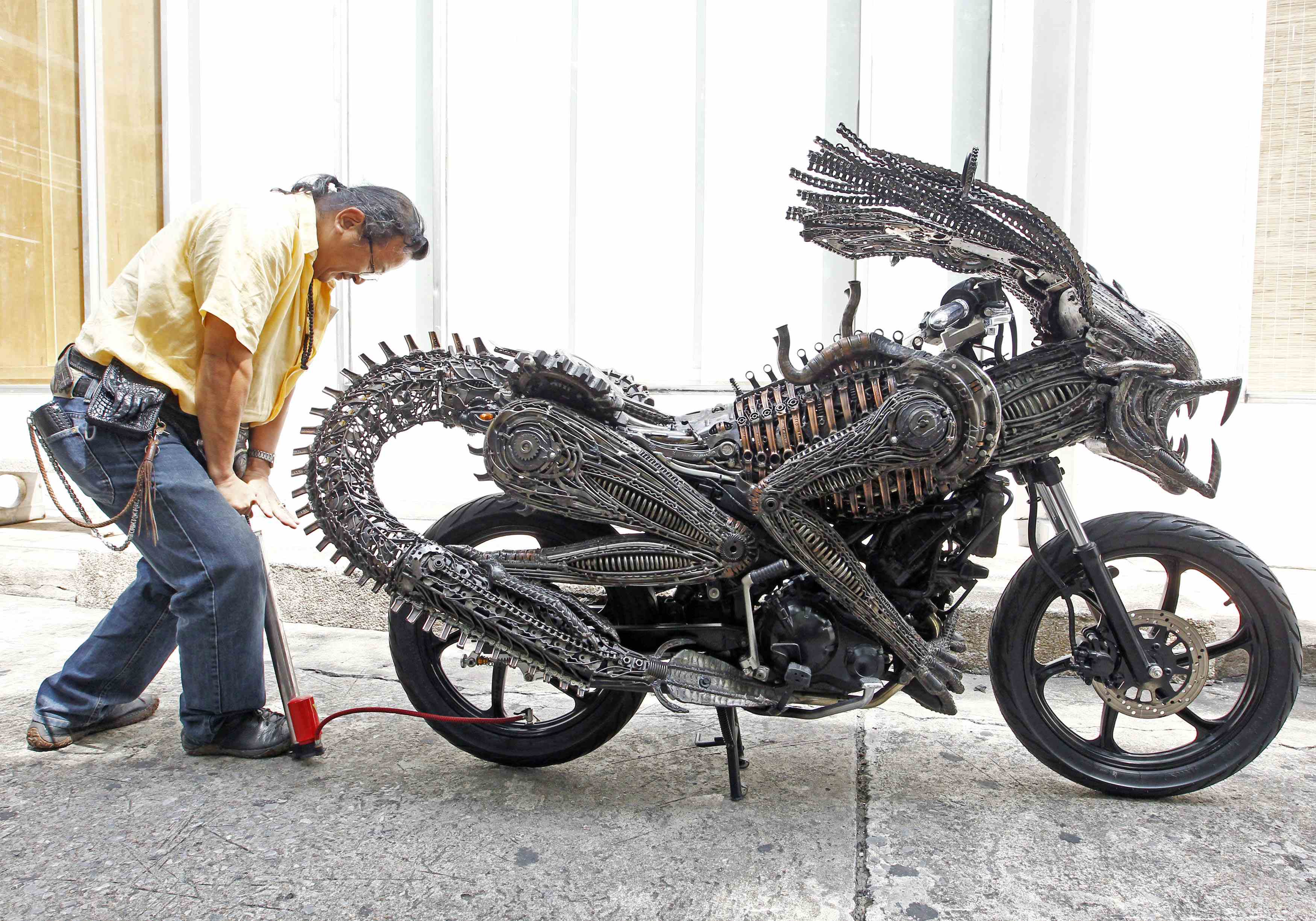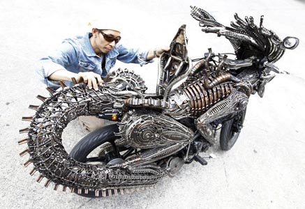 Этот сверкающий каждым своим винтиком мотоцикл выглядит так, будто только что выехал со съемочной площадки космического блокбастера. На самом же деле его создатель – обычный механик из Бангкока, собравший этого хромированного монстра из деталей старых, отживших свой век автомобилей.