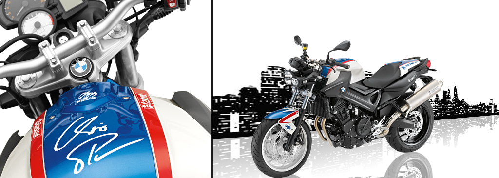 Итак, встречайте: F 800 R Chris Pfeiffer Edition... Модель является практически копией «боевой машины» Криса! Как во внешнем плане, так и по «начинке». Обращает на себя внимание небезызвестная фирменная трехцветная раскраска BMW Motorsport. Причем передний колесный обод белый, а задний черный. Спортивную яркость модели дополняет красная пружина заднего амортизатора. Бензобак украшает эксклюзивный автограф Пфайффера. Пассажирские сиденье укрыто стильной заглушкой с фирменными стикерами официальных спонсоров. Эффектно выглядит и переднее крыло. Кроме того, модель отличается титановой выпускной системой Akrapovic специальной серии, которая отличается меньшим весом и низкой тональностью звучания, задней диодной светооптикой.
