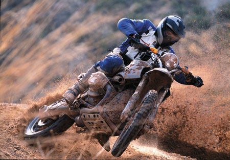 Разминка на закрытом полигоне подошла к концу, и мы уже мчимся по каменистой дороге за лидером группы. Темп выбран довольно интенсивный, и на поворотах я начинаю заметно отставать – всё-таки длина мотоцикла требует серьёзного привыкания. На прямых… Ну что тут сказать? 105 л.с., абсолютный рекорд для серийного жёсткого эндуро, и… невозможность реализации этой мощности. Дороги в первый день были в основном прямые – временами стрелка спидометра приближалась к отметке 120 км/ч. Пятая передача, полный «газ» – и вот уже стрелка болтается на 140. Так разогнался? Вовсе нет – привод спидометра организован от трансмиссии, а колесо буксует. В любой ситуации, на любом покрытии я срывал его в букс, когда хотел. Безусловно, по разгону с этим мотоциклом тягаться проблематично. Откровения возникают, когда хочешь затормозить: тормоза, конечно, великолепны, но масса даёт о себе знать – больше всего её чувствуешь именно на торможении.