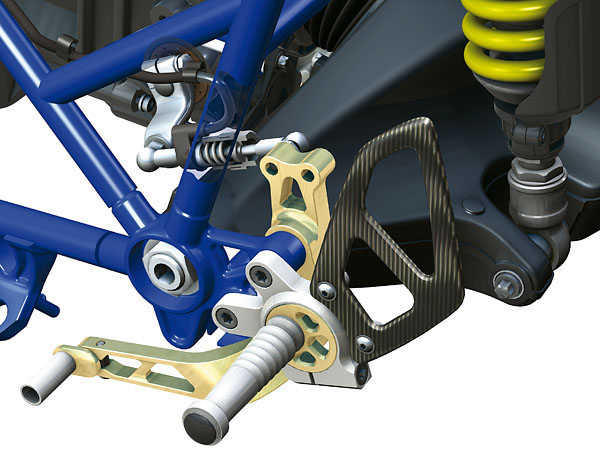Ещё одним «приветом» из мира гонок является наличие «спид-шифтера», установленного на 6-ступенчатой коробке передач со сближенными передаточными числами, что позволяет менять передачи без сброса газа и выжима сцепления. И здесь снова можно говорить о том, что ранее такое устройство на серийных мотоциклах не устанавливалось.