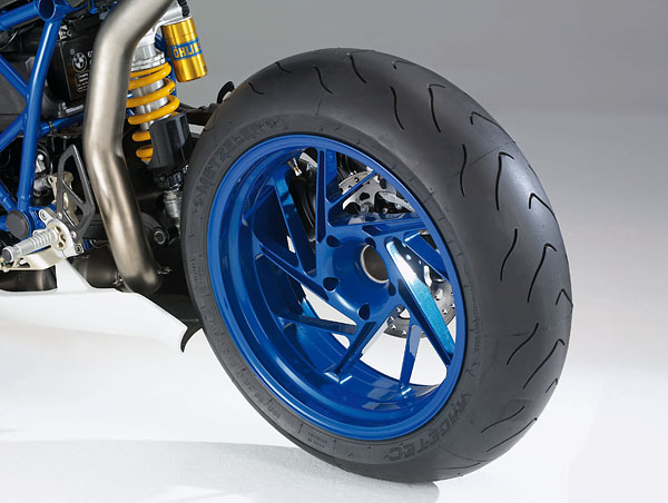 Однако стандартная комплектация модели внедорожными покрышками существенно сужала сферу её эксплуатации и соответственно контингент потенциальных пользователей. Ведь в большинстве почитатели бренда BMW предпочитают передвигаться на своих любимцах и по асфальту тоже. Ну а раз так, то через полгода с момента дебюта конструкторы компании решили запустить в тираж чистокровную асфальтовую версию – мотард HP2. Причём для удивительного превращения HP2 из жёсткого внедорожника в динамичный супермото достаточно поменять колёса и шины. Для этой цели BMW выпустила дорожные колёса диаметром 17 дюймов, укомплектовав их бескамерными покрышками Continental Road Attack (120/70 и 150/70). Модель отличают также чёрные анодированные ободья, более крупные тормозные диски (320 мм) и, конечно, цена на € 1000 выше. К комплекту прилагаются адаптированные протекторы вилки и инструкция по установке. Так что, в принципе, можно и самому «переориентировать» свой HP2, ведь колёса можно использовать с другими покрышками, например, с Bridgestone BT020, Metzeler Roadtrac Z6, Pirelli Diablo Strada и Scorpion Sync.