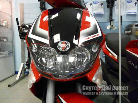 Вот только преданные поклонники старого Runner вряд ли примут её с восторгом. Некогда ультраспортивная модель стала почти универсальной. Началось это не вчера и не сегодня. Но если первое появление «четырёхтактника» многие не заметили (тогда, в 2000-ом, он был 180-кубовым и ставился параллельно с двухтактником того же объёма), то безальтернативную замену двухтактника 200-кубовым четырёхклапанником народ воспринял, скрипя зубами, даже новая, более жёсткая и долговечная вилка и удлинённая «пассажирская» часть седла не слишком подсластили пилюлю. Манеры-то скутера стали спокойными и размеренными, что не слишком вязалось с агрессивными формами, пусть и «обмыленными» в соответствии с модой восьмилетней давности.Теперь пришёл конец и внешней агрессии. Изначально дизайн аппарата должен был соединить концепцию предшественника и нового стиля, впервые воплощённого в Nexus. Но, похоже, какой-то умник из технологов настоял на замене двух окрашенных боковых панелек (тех, что вокруг серебристых вставок) на матовые чёрные – и дизайн стал не только дробным, но и статичным. Не добавили визуальной динамичности и увеличенное переднее колесо, и не самая стильная передняя оптика (лично мне она напомнила не менее «удачный» рестайлинг FIAT Punto). А пониженное седло при неизменной высоте руля ещё и сделало посадку водителя почти вертикальной.