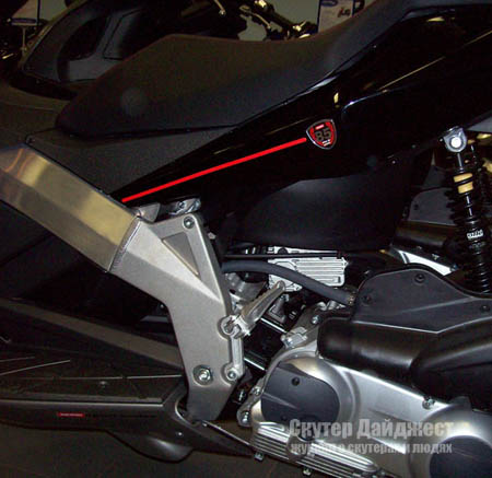 Но при всей внешней схожести и предельной унификации «полтинник» и «четвертинка» – совершенно разные машины. Прежде всего, по компоновке. 50-кубовая модель – верх радикализма, ибо скроена по-мотоциклетному. Двигатель – знакомый многим по куче аппаратов, в том числе по предшественнику и полному тезке аппарата, Derbi GP1 – двухтактная «водянка» Piaggio Hi-Per2 Pro. Причем не с инжектором, а (как, собственно, и раньше) 17,5-мм карбюратором, что резонно: движок большинство сразу после покупки будут тюнинговать «в мясо» – к гадалке не ходи.В общем, мотор стандартный скутерный, стандартный у него и картер, что потребовало оригинального крепления к раме в двух точках. Спереди снизу – за проушины, как и на скутерах традиционной компоновки, сзади – за кронштейн, изначально предназначавшийся для тормозного суппорта. Единственное, что пришлось сделать заново, это выпускную систему; теперь она проходит под мотором, а выпускной патрубок выходит под углом непосредственно перед задним колесом. Теперь обычный тюнинговый «саксофон» не поставишь, но, думаю, это не проблема: подсуетятся тюнингеры, никуда не денутся. А на выходном валу редуктора вместо колеса стоит звездочка цепной главной передачи – как на мотоциклах. Мотоциклетная здесь и задняя подвеска с моноамортизатором и алюминиевым маятником. Короче, почти спортбайк – только бак под седлом, КПП-автомат, платформы вместо подножек и колеса не 17, а 14 дюймов.