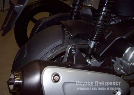 Моноамортизатор водворили по центру рамы, перекинув туда два дополнительных алюминиевых рычага. Интересно, что эти рычаги крепятся к картеру там же, где дополнительный лонжерон задней подвески (справа) и крышка вариатора (слева по ходу движения), причем прямо в тех же точках удлиненными болтами. Понятно, что долговечности (особенно на наших разбитых дорогах) это решение скутеру не добавит. Да и смотрится неряшливо.