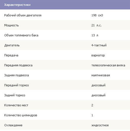 Что же здесь? А здесь мы видим неплохой – очень неплохой! – утилитарный скутер со спортивными нотками во внешности и манерах. Многим этого окажется недостаточно – но тогда добро пожаловать доплатить четырехзначную сумму за Runner VXR или DNA. С другой стороны, многим потенциальным покупателям «утилитарщины» подвеска может показаться жестковатой. И зря: настройки ходовой части позволяют не только получить то самое «удовольствие от вождения» по дороге на работу, но и служат дополнительным фактором безопасности в дождь или при скоростном прохождении «пробок». Что же до «лошадиной недостаточности», то по-настоящему она чувствуется только на МКАДе и за городом, в городе же 100 км/ч «максималки» хватит за глаза.параметры