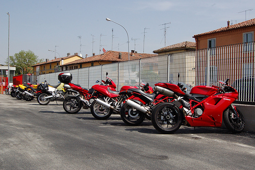 Завод Ducati находится в небольшом, по нашим меркам, итальянском городке Болонье. Забегая наперед скажу, что и сам завод, в общем-то, небольшой, опять же по нашим меркам - наш любимый, хотя уже и мертвый, Киевский мотоциклетный завод, выглядит куда внушительнее... Под заводом стоянка для транспорта работников. На стоянке специально выделена площадь для мотоциклов, так как многие рабочие ездят на работу на мотоциклах, (естественно, на Ducati). Кстати, сотрудники могут раз в год покупать себе мотоцикл со скидкой. Строгостей с пропускной системой - никакой. Записался у охранника, что идешь в музей - и ходи, гуляй. Только почему-то фотографировать в цехах нельзя... Хотя я ничего секретного там не обнаружил. Зато обнаружил пару интересных и нестандартных технологических моментов. Сопровождавшая меня сотрудница-экскурсовод рассказала, что на заводе Ducati при сборке двигателей перешли на новую технологию, отказавшись от конвейера. И теперь каждый двигатель собирает один, конкретный человек! Я себе представил производительность такой ручной сборки и заподозрил, что это не шаг вперед, а прыжок назад, о чем тут же начал спорить с милой итальянкой, объясняя ей, что когда Генри Форд изобрел конвейер, он обошел всех конкурентов по качеству, и при этом очень снизил себестоимость продукции. Но ее доводы были таковы: конвейерная сборка у итальянцев давала много брака - один рабочий болт недокрутил, другой, пока обсуждал вчерашний футбольный матч, не заметил, как мимо него проехал мотор, и вообще свою операцию не сделал. Вот и выходило ведро с болтами, а не мотор.