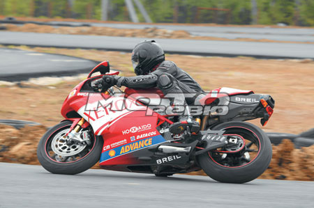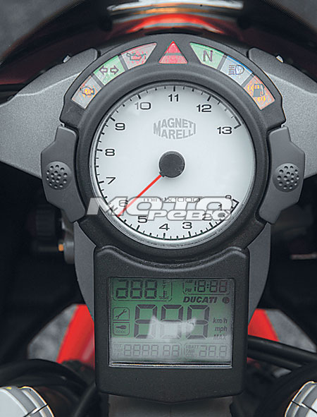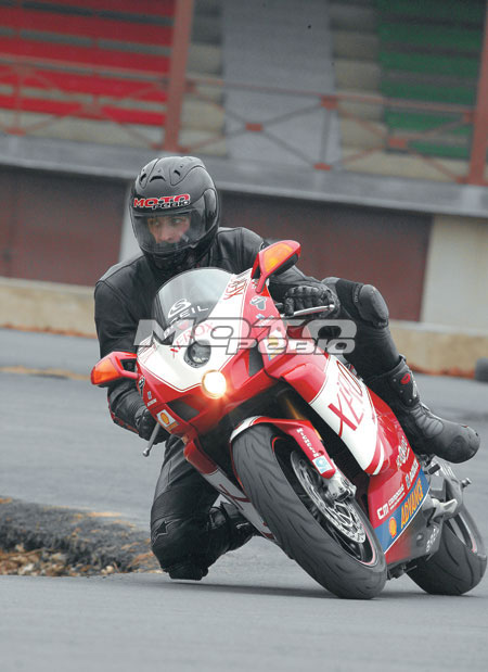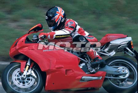 Что же касается эргономики в целом, то всё по-гоночному выверено и понятно. Как обычно, главенствующую роль занимает тахометр, что вполне естественно, учитывая несокрушимую тягу литровой двойки. А ещё тестовый аппарат был раскрашен в цвета команды Xerox, выступающей ни много ни мало в супербайке. Это ещё парочка тысяч евро к цене, которая дамокловым мечом висела над моей головой, не давая максимально использовать возможности мотоцикла. Что ж, обычно аристократы, если и снисходят до общения с чернью, то только ввиду крайней необходимости и на очень непродолжительное время. Это я к тому, что пассажир здесь даже в принципе невозможен, для этого есть Ducati 999 с крайне «демократичной» ценой Е 17000… Другими словами, какое-либо иное использование этого мотоцикла, кроме как не на треке, будет своего рода квинтэссенцией крыловского кормления свиньи апельсинами. Надо ли уточнять, что тормозные шланги здесь армированные, колёса Marchesini, а весь пластик в сборе весит не больше, чем ваш давно не стираный носок. Пытаясь выключить постоянно работающий в голове «калькулятор», выезжаю на хитросплетение дорожек картодрома. Помнится, в одном известном английском мотоиздании читал, что Ducati плохо подходит для медленных поворотов. Однако на картодроме у меня сложилось совершенно другое впечатление. Со своим фирменным секретом – сочетание рамы из хроммолибденовых труб и низкорасположенный центр тяжести – мотоцикл «валится» в любые повороты с такой быстротой и охотой, что только образ нависшего с калькуляцией за ремонт мотоцикла главного редактора заставляет осторожничать и не выбирать максимум возможностей как подвески, так и резины. Именно у Ducati в поворотах возникает такое ощущение, что аппарат невозможно сорвать в принципе. Конечно, многие могут сказать, что это работа подвески Ohlins и что, мол, поставь такой же набор дорогостоящих компонентов на любой японский мотоцикл, и он поедет так же. Смею вас заверить: не поедет! Мне приходилось кататься почти на всех современных литрах, «обнищавшие» владельцы которых обвешивали их самым дорогостоящим тюнингом аж по самый свой копчик. Конечно, в управлении эти мотоциклы становились намного интереснее, но можете мне поверить, что Ducati там и не пахло. Отрадно было также отметить и тот факт, что инженеры компании серьёзно поработали с сухим сцеплением, во-первых, значительно уменьшив усилие на рычаге, а во-вторых, решив его такого сомнительного фирменного девайса, как звук сотни ржавых гаек в пустом ведре. И теперь ничто не мешает наслаждаться утробно-хищным стоккато L-образного твина, изливаемым, понятное дело, ещё одним «бюджетным» девайсом Termignoni.
