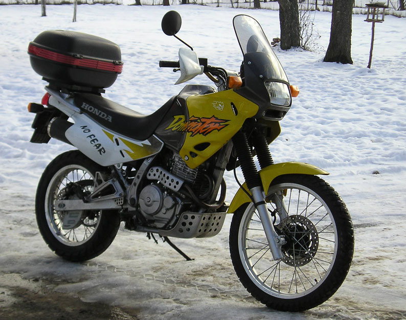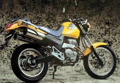 Модель NX650 Dominator укомплектована 4-клапанным одноцилиндровым двигателем, который сначала появился в одноцилиндровом ретро-байке XBR500. Этот движок был "разогнан" до 650 кубов и установлен во внедорожник, но некоторые детали, такие как обтекатель, установленный в раме, и окрашенный в серебристый цвет пластмассовый ударный лист, раскрывали его претензии на дорожник. Он также был очень низок в цене - седло крепилось на болты, поэтому бардачок хранился внизу возле передней нижней трубы рамы в пластиковой коробке типа "укради меня", которую можно открыть любым тупым инструментом. Стилизация была, по крайней мере одно время, supersharp - подтверждение тому высокий уровень выхлопа - почти как у Ducati. Байк фактически создал отдельный городской traillie-класс и имел большой успех, несмотря на свою традиционную для Хонды высокую цену. Теперь в 2001, без достаточных оснований Dommie - все еще с нами в выставочных салонах. Один взгляд на спецификацию скажет вам о многом - 44 л.с., 375 фунтов, 50 миль на галлон и большая скорость, свыше 100 миль в час. Если не брать в счет изменения трубчатой стальной конструкции рамы, байк фактически остался неизменным со времени своего первого выпуска. Он продается примерно за £5000 ( как видите, скидка небольшая). XBR500 производил такую же мощность 15 лет назад и был легче, экономичнее и быстрее. Движимые потребностью в успехе на треке, все усилия Большой четверки вкладывались в разработку их байков с двигателями объемом более 600 кубов. Странно, но ничего стоящего из этого у них не вышло - несмотря на вердикт байка "превосходный", это мотоцикл, который остался позади технологии. Если 100 л.с. могут быть выжаты из дорожника CBR600, мы можем надеяться на 60 л.с. от 600-кубового одноцилиндровика сейчас.