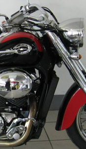А вот Suzuki — не середина, но уж точно золотой экземпляр. Это не Круизер — это просто Лайнер. Он на порядок лучше и Shadow, и DragStar. Внешне он такой же крупный, такой же стильный, но когда я сел на него, то он показался еще более крупным и взрослым. Он очень удобный, и как для меня, то комфорт, им предоставляемый, тянет на все 5 звезд. При желании, ему можно поставить ветровое стекло и ехать без остановки до самой ''пенсии''. Наверное, если на первых двух можно ездить и на ''дальняк'', и от кафе к кинотеатру, на этом можно и нужно ездить и дозаправляться на ходу, иных вариантов просто нет! Он так подкупает своим комфортом и кайфом от езды, что останавливаться пить чай в кафе нет ни малейшего желания, слазить с него не хочется вообще! Это просто какая-то магия. Привод карданный, охлаждение водяное — это плюсы! Руль и зеркала такие же, как у конкурентов, но сидеть и ехать удобнее. И скорость набирает вполне живо, хотя на такой-то колеснице хотелось бы и пошустрее. Пятая повышающая передача вообще приводит байк в уныние, так что лучше активнее работать первыми четырьмя. Крейсерская — такая же, как у конкурентов, но скорость с комфортом ''люкс'' и просто скорость — это уже повод поговорить и вдоволь нахвастаться на очередной заправке или у кафешки. Голова не болит ни о коробке, ни о ходовой (хотя рама могла бы быть и пожестче). Все работает, ничего не пробивает и не стучит. Все идеально, мотоцикл отлично держит курс, однако перебарщивать со скоростью не стоит: его стихия — круизный режим.