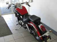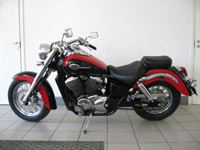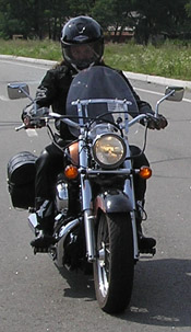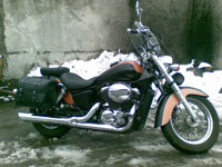 Honda: водяное охлаждение, заливная крышка радиатора спрятана под пластиком у рулевой колонки. Размер и габариты: он такой же большой, как и версия в 750 ''кубов''. Привод на колесо цепью? Это на любителя. Аргументов очень веских ''за'' и ''против'' нет. Скажем так: в бардачке под сиденьем сразу следует оставить место для баллона со смазкой. Плюс подтягивать цепь надо периодически, а периодичность напрямую зависит от манеры езды. Посадка, как по мне, не совсем удобна, можно чуть дальше вынести подножки, или же поставить платформы, тогда ногу можно будет ставить в разных положениях. Но это уже тюнинг. Сиденье стандартное, дискомфорта не испытываешь, но и удовлетворения особого от посадки нет. Все просто, добротно и аккуратно. Руль тоже стандартный, рукам вполне удобно, в зеркалах — достойный обзор. Спидометр, как и у всех, на баке. Там же салатная лампочка нейтрали. Трогаюсь, разгоняюсь, мотоцикл уверенно набирает ''сотню'' на третьей передаче. Что сказать, ветер в лицо на круизере — это нормально. Его крейсерская скорость с полной загрузкой — 120. При этом сдувать не будет, а вот если набрать и постоянно держать ''140'' и больше, то о комфорте можно забыть. Искать минусы в этом мотоцикле нет смысла. При росте до 180 см на нем будет удобно любому, хоть в тебе 60 литров водоизмещения, хоть 160, и дефиле по городу на скорости 60 км/ч будет приносить радость и удовольствие. В сервисе мотоцикл очень неприхотлив, на него в каталогах есть шикарный выбор тюнинга и расходников, как оригинальных, так и лицензионных, так что проблем быть не должно. Также в отличие от Yamaha, мотор не нагружен декоративными пластмассовыми накладками и еще чем-либо, мотоцикл прост. Касательно иных моментов: коробка не вызывает никаких вопросов, а мотор крутится так, как ты его крутишь. Этот аппарат описываю первым потому, что он просто добротный, никакого восторженного мнения о себе он не оставил, просто хороший вариант для повседневной езды или воскресного дефиле.