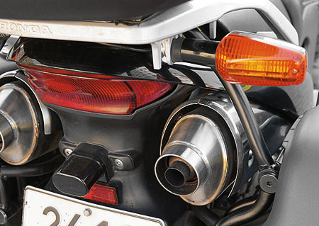 расположен ничем не защищенный глушитель. Посадка на байке гордо-высокая и