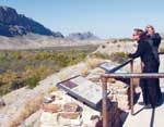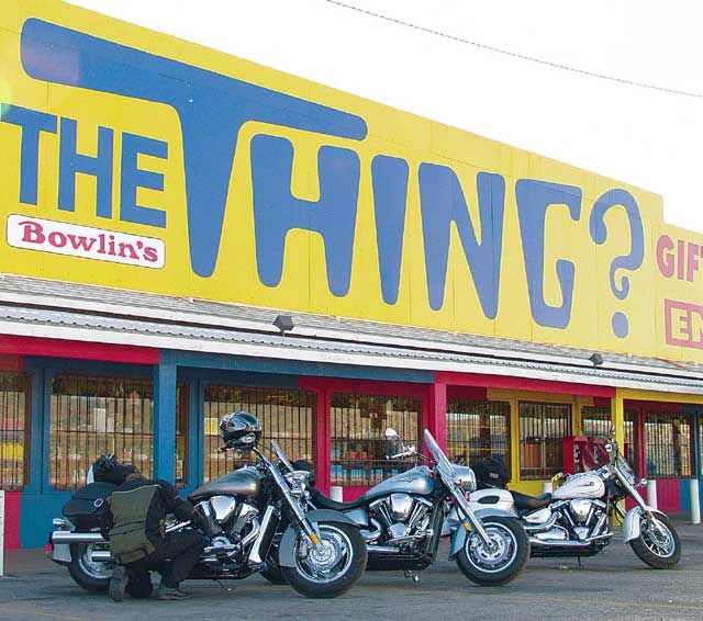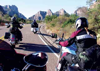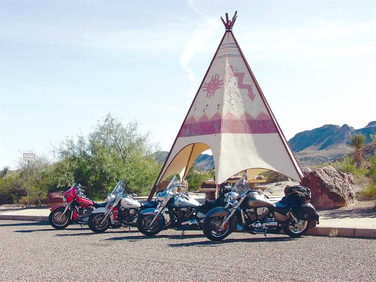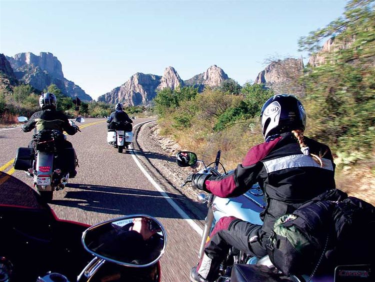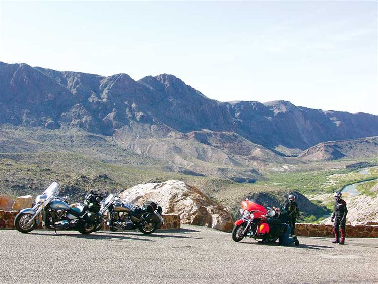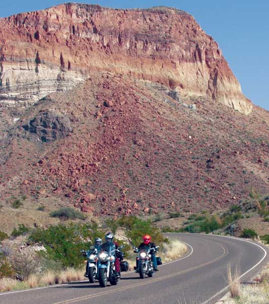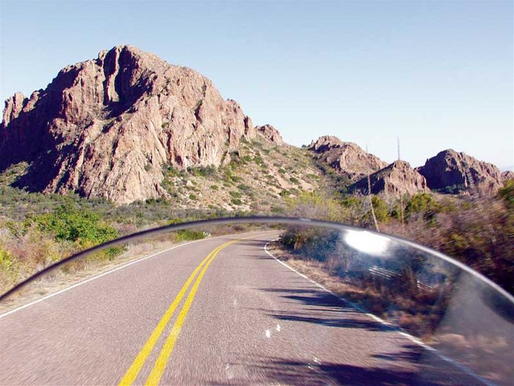 Прежде чем попасть в Техас, нам предстояли два длинных, холодных дня езды по федеральной автостраде 10. Во время одного заезда вечером, температура упала ниже 30 градусов прежде, чем мы успели добраться до нашего отеля. (Уааааа.) Мы выглядели полными идиотами (ведь это, по меньшей мере, глупо - кататься в таких условиях), живя каждый день от одной бензозаправки до другой, запихивая арахисовые орехи через отверстия в защитной маске, запивая из соломинок, чтобы не терять слишком много тепла при снятии шлемов. Расстояние между теми милосердными бензозаправками колебалось от 100 до 140 миль, в зависимости от пустынных ветров и мочевого пузыря ведущего байкера. Удивительно, расход бензина у всех байков в среднем составляет 33 мили на галлон. Бензобак мотоцикла Kawasaki объемом 5.5 галлона имеет небольшое преимущество перед бензобаками байков Yamaha и Honda (5.3 галлона). Эти байки при обычном повседневном использовании могут иметь показатели расхода бензина 38 миль на галлон. Обычно, мы считаем недостаток дипазона без дозаправки большим неудобством для такого рода поездок, но при таких холодных условиях мы были благодарны за эти остановки. Причина, по которой мы приехали. В то время, когда мы думали и разговаривали о том, зачем мы морозили наши задницы там, на самой мучительной федеральной автостраде в Америке, мы поднялись по горному склону на Ван Горн, Техас и двинулись на юг. Парк, убежище площадью 801,163 акр, строительство которого остановилось в 1944 году, обещал великолепие подобное Йосемитскому национальному парку, нетронутому еще туристами. Мы могли видеть, почему люди больше не заходят туда. Даже после того, как мы повернули на юг, на одинокое Шоссе 90, нам оставалось 250 миль до ворот парка. Первые несколько дворников, однако, встретили нас с улыбкой, и мы решили двигаться по более длинному маршруту на Шоссе 67 и 170, который позволил бы нам видеть ранчо Биг-Бенд, государственный парк на западе от национального заказника (района, включенного в систему национальных парков). Нам не было слышно одно за одним маниакальное "УууууХуууу!", когда мы летели над подъемами и закрученными, захватывающими дух спусками Шоссе 170. Это были крики дикого восторга. Мы мчались по одной из настоящих американских горок: не для слабонервных или слабо подготовленных байкеров. Это было совсем неожиданным вознаграждением в конце такого скучного путешествия, этот безумный полет, в котором все смешалось в одну красочную массу: река, скала и небо. Без сомнения, Honda был самым подходящим байком для этой сумасшедшей и эйфоричной езды. Дело конечно же в том, как этот байк ведет себя на поворотах. Просто посмотрите вперед, наметьте вашу линию и VTX покорно последует указанному пути подобно тому, как поезд движется по рельсам. Этот тип предсказуемости не только делает повороты более приятными и безопасными, он также позволяет вам расширять ваши возможности как мотоциклиста. Устойчивость стоит его веса на дорогах подобно Шоссе 170, к тому же байк имеет подходящий дорожный клиренс. Если бы вы были там с нами и захотели б острых ощущений, вы могли бы сесть за руль Ямахи и пытаться ехать наравне с Хондой. Клиренс у байка Road Star - позвольте сказать, не включенная в список характеристика. Он касается земли, когда дует ветер. Добавьте к этому чрезмерно мягкие подвески и вы поймете, что дело-дрянь. Kawasaki имее