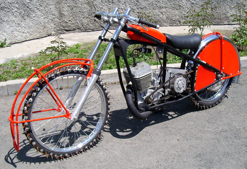 Мотоцикл для спидвея с настроенным выпуском и не имеющий коробки передач .