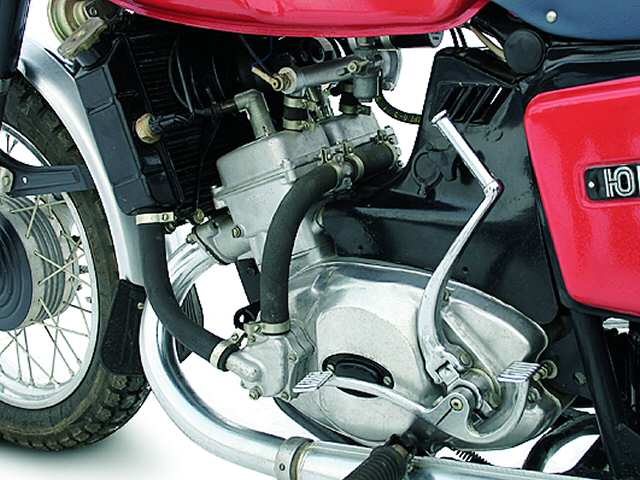 Двухтактный одноцилиндровый, карбюраторный в блоке с коробкой передач