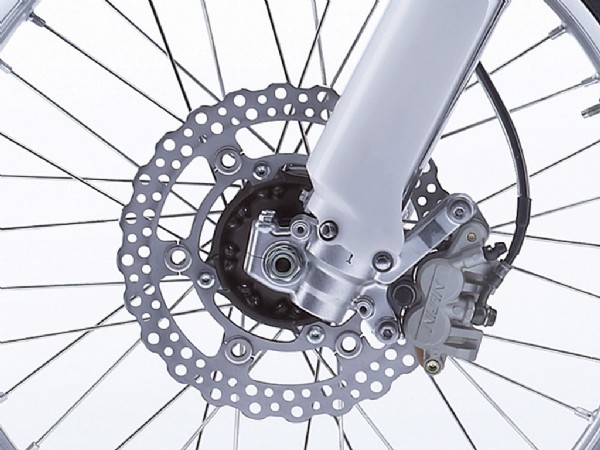 Тормозные диски лепестковой формы так же уверенно останавливают KX125,