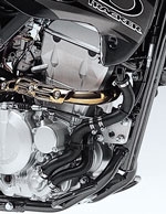 Цилиндр, покрытый никелем, кремнием, фосфором, обеспечивает отличные свойства передачи тепла. Поршень внутри него - кованый, алюминиевый, масляноохлаждаемый. Вентилятор крепится к левому радиатору, чтобы поддерживать постоянную рабочую температуру в дороге. На дорогах или в грязи карбюратор типа Mikuni BSR36 CV, который "пьет" из бензобака с большим запасом хода, обеспечивает плавный и четкий ответ дросселя.