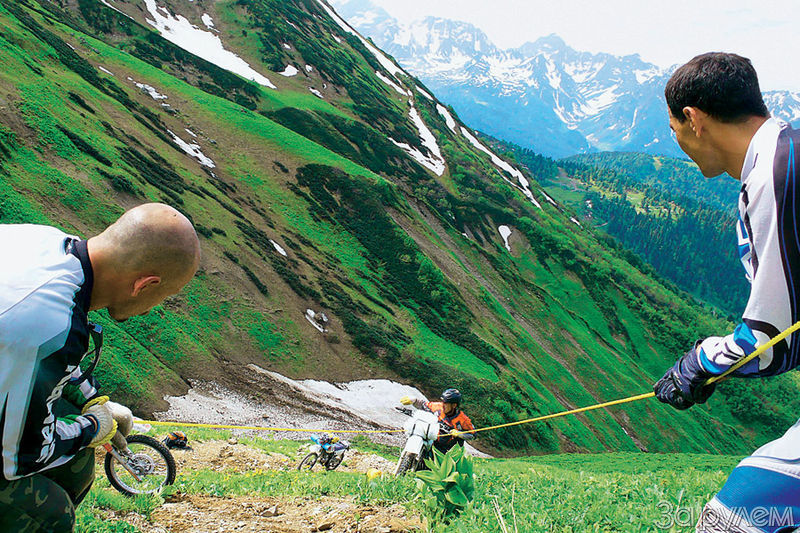 тянут привязанный байк вверх, а еще один толкает