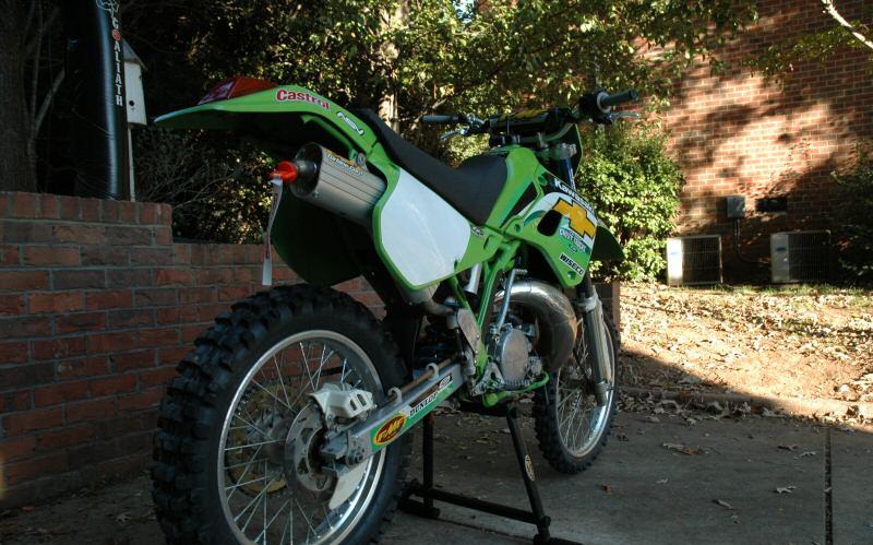 Kawasaki KMX125. Head races will be squared, fork oil thin and the shock
