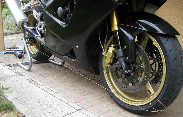 на мотоцикле 5-10 раз, чтобы исключить перекос перьев вилки.