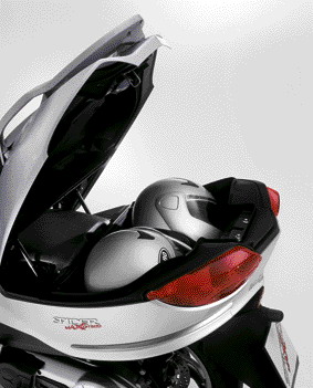 Malaguti Spidermax GT500 – не только мощный, и стильный, но и достаточно функциональный. Например, в тот же багажник без осложнений поместятся два шлема-интеграла. Развитый пластиковый обвес обеспечивает как водителю, так и пассажиру отличную защиту от ветра. В штатную комплектацию входит иммобилайзер и система автоматической остановки двигателя, срабатывающая при аварии. Из дополнительных аксессуаров к скутеру можно приобрести центральный кофр, мягкую спинку для пассажира и фирменную противоугонную сигнализацию.