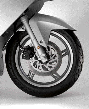 Хорошие ходовые качества Spidermax GT500 обеспечивают не только жесткая рама и адекватная подвеска, но и большие (по скутерным меркам) 16-ти дюймовые колеса. В добавок к этому, скутер оснастили мощной интегральной тормозной системой. На переднем колесе установлено два тормозных диска диаметром 270 мм, укомплектованных 2-х поршневыми плавающими скобами. Сзади стоит диск чуть меньшего диаметра – 260 мм. Левая ручка тормоза действует на задний и один из передних тормозных суппортов, правая – на второй передний суппорт.