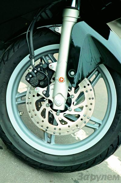 Тормоза Spidermax GT500 цепкие – мама не горюй! Однако в каких-то ситуациях это достоинство превращается в свою противоположность: к срыву тяготеет переднее колесо. И вот почему. 2-поршневые суппорты с плавающими скобами готовы молниеносно заблокировать оба 270-мм диска. Тормозная система хотя и комбинированная (при нажатии на левый рычаг срабатывают одновременно передний и задний контуры), но ведь АБС нет. И блокировка происходит внезапно – лишь на чуть снизится коэффициент сцепления покрышки с асфальтом. Эту особенность водителю придется учесть, и я тоже постарался максимально снизить риск экстренного торможения.