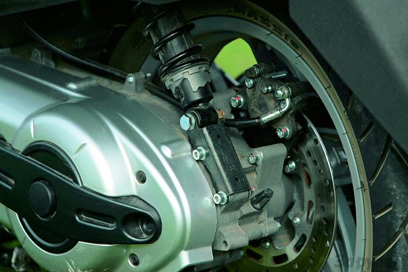 подвеске прогрессию (как на Gilera Nexus 500) не стояло. Главным критерием было обеспечение водителю и пассажиру максимального уровеня комфорта. Поэтому установили набор из двух амортизаторов, которые равномерно распределяют нагрузки на раму и обеспечивают достаточный запас жесткости. Учитывая огромный (48-ми литровый) багажник, находящийся под сидением, такой выбор можно считать оправданным.
