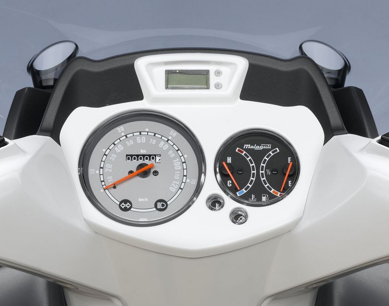 Большой багажник, расположенный под сиденьем, способен вместить целых два половинных шлема. Многофункциональная аналоговая панель приборов выглядит стильно и предлагает водителю полный спектр информации о процессе движения и техническом состоянии его железного коня. Цена базовой версии Malaguti Blog в Европе - порядка 2 500 евро. На выбор предлагаются четыре цвета – белый "слоновая кость", серебристый металлик, серый "титановый" и черный.