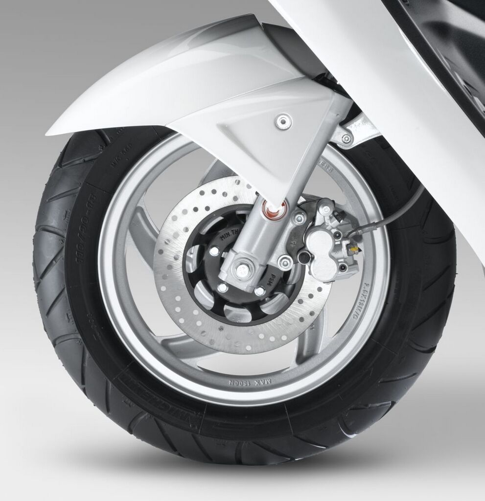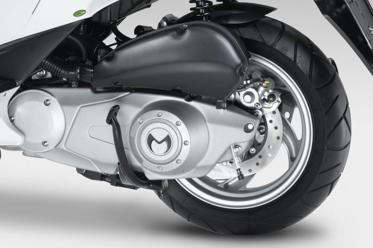 Скутер также может похвастаться достаточно высоким для аппаратов этого класса клиренсом, высотой сиденья в 770мм, отличной маневренностью и легкостью в управлении. Колеса – 13-дюймовые с дисковыми тормозами. Сухой вес машины – 138 кг.