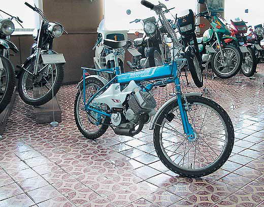 Масса, кг 36 База,мм 1060 Максимальная конструктивная скорость, км/ч 25 Расход топлива при скорости, л/100 км 1.8 Рама Трубчатая, сварная Подвеска переднего колеса - Задняя подвеска - Размер шин, дюймы 2.25 х 16 Тип двигателя Motobecane карбюраторный ,двухтактный, с кривошипно-камерной продувкой, охлаждением встречным потоком воздуха. Рабочий объем, куб.см 50 Диаметр цилиндра , мм 38 Ход поршня , мм 44 Степень сжатия 6.0-7.0 Максимальная эффективная мощность двигателя, кВт (л.с.) при 5000 об\мин 1.2 (1,65) Тип коробки передач Клиноременная передача Сцепление Автоматическое Система зажигания Безконтактная Воздушный очиститель С бумажным фильтрующим элементом Система выпуска газов Глушитель шума выпуска с перегородками для дросселирования газов.